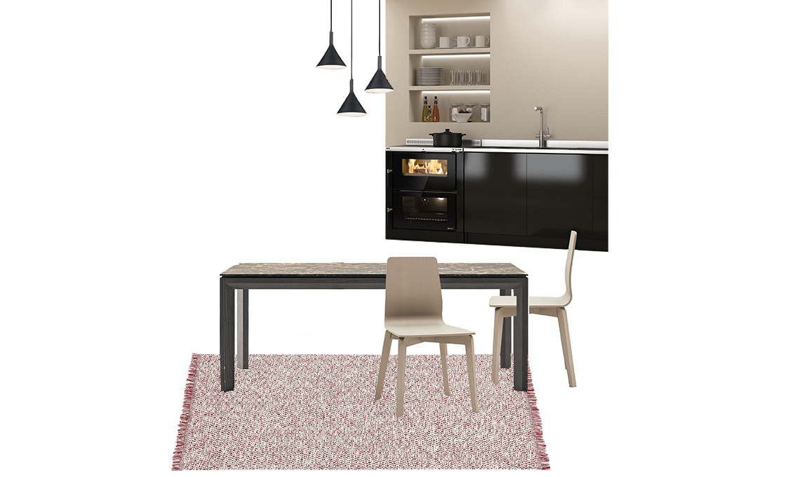 ø cm 25,5x30h € 200 cad]. 2Tavolo in legno Maestrale allungabile [cm 90x120/210x75h € 1.750] e sedie Modus [cm 48x50x84h € 307]. Di [Scandola]. 3Tappeto Rörkär a tessitura piatta [Ikea, cm 80x150 € 25].