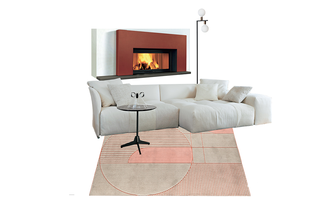 € 518]. Sofà componibile Pixel [Saba Italia, misure e prezzo su progetto]. Tappeto Eiffel [Calligaris, cm 160x240 da € 495].