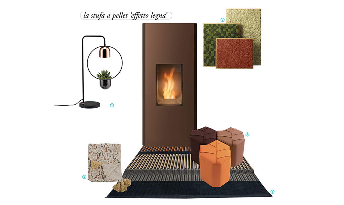 Tecno-focolare Core nella stufa a pellet Mako [MCZ, cm 50x55x104,5h]. 1 lampada Fanja [Paulmann, cm 37x62,5h]. 2 quadri Framed, realizzati con licheni stabilizzati [Nordgröna]. 3 pouf Leaf Seat Autumn in lana sostenibile [Design by Nico, cm 40x 57x39h]. 4 tappeto Papel in filato di carta sostenibile certificata FSC® e PEFC® [Karpeta, cm 170x 240]. 5 plaid Filipa Throw in cotone riciclato [Bloomingville, cm 130x160].