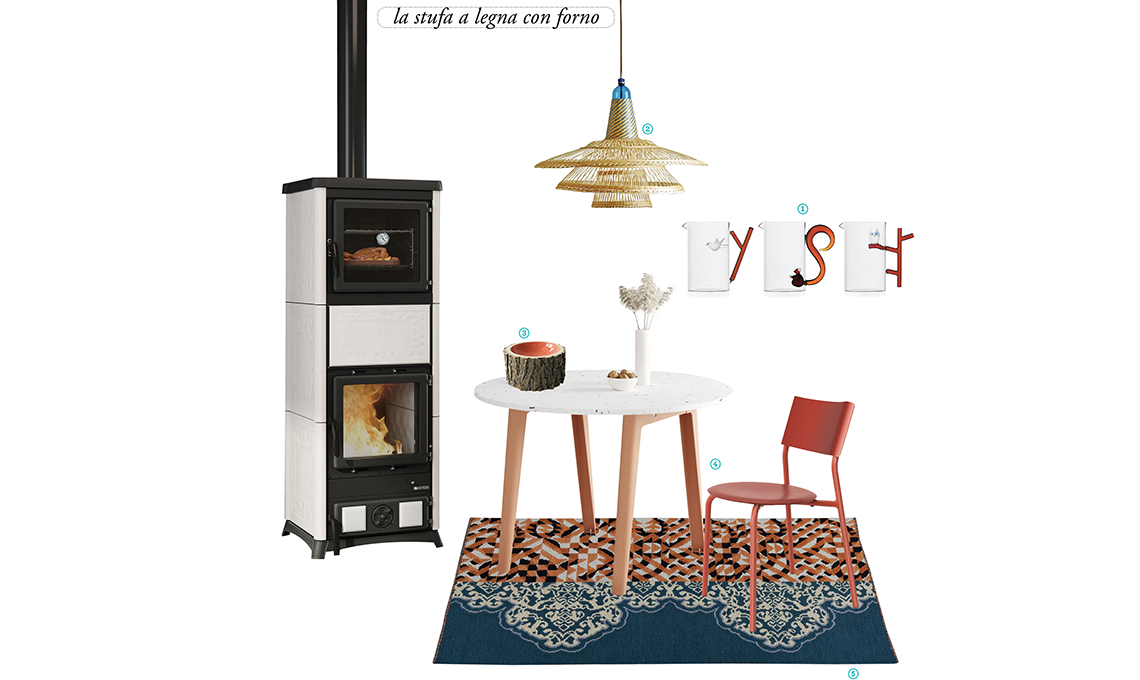 Stufa a legna Nova Forno [La Nordica Extraflame, cm 55,9x56,9x149,6h]. 1 brocche in vetro soffiato Animal Farm [Ichendorf, da ø cm 11x18h]. 2 lampada a sospensione Chimbarongo Single Triple, realizzata a mano con vimini e bottiglie in PET riciclato 3 ciotola Log Bowl size 8 Coral, ricavata da un tronco di