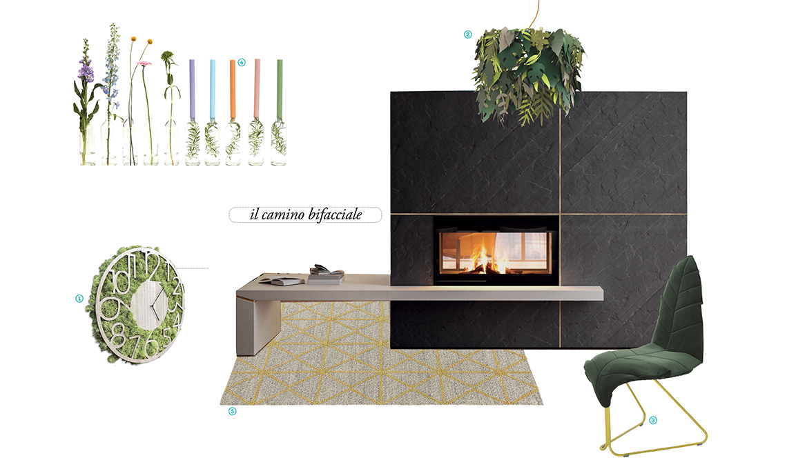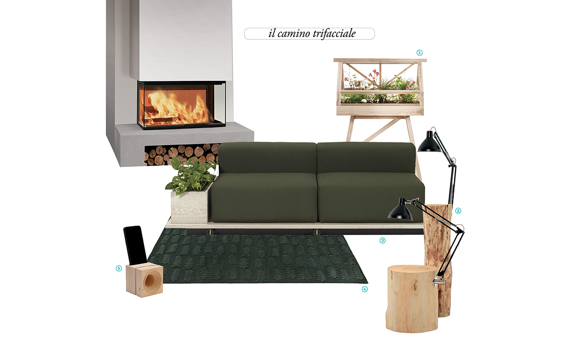 Camino trifacciale Windo3 85 [Edilkamin, cm 92x63x150h]. 1 miniserra Greenhouse [Design House Stockholm, cm 95x40x153h]. 2 lampade Piantama [Mogg,ø cm 22/30x50/100h]. 3 divano Meet O2asis [Offect, cm 193x86x61h]. 4 tappeto One Forest Share: per ogni tappeto venduto viene piantato un albero [Mum’s Forest, cm 140x200]. 5 amplificatore audio Cube, realizzato con il legno recuperato dopo la ‘tempesta’ Vaia, che nell’ottobre 2018 ha raso al suolo le foreste di un’area delle Dolomiti e delle Prealpi Venete [Vaia, cm 10x10x10].