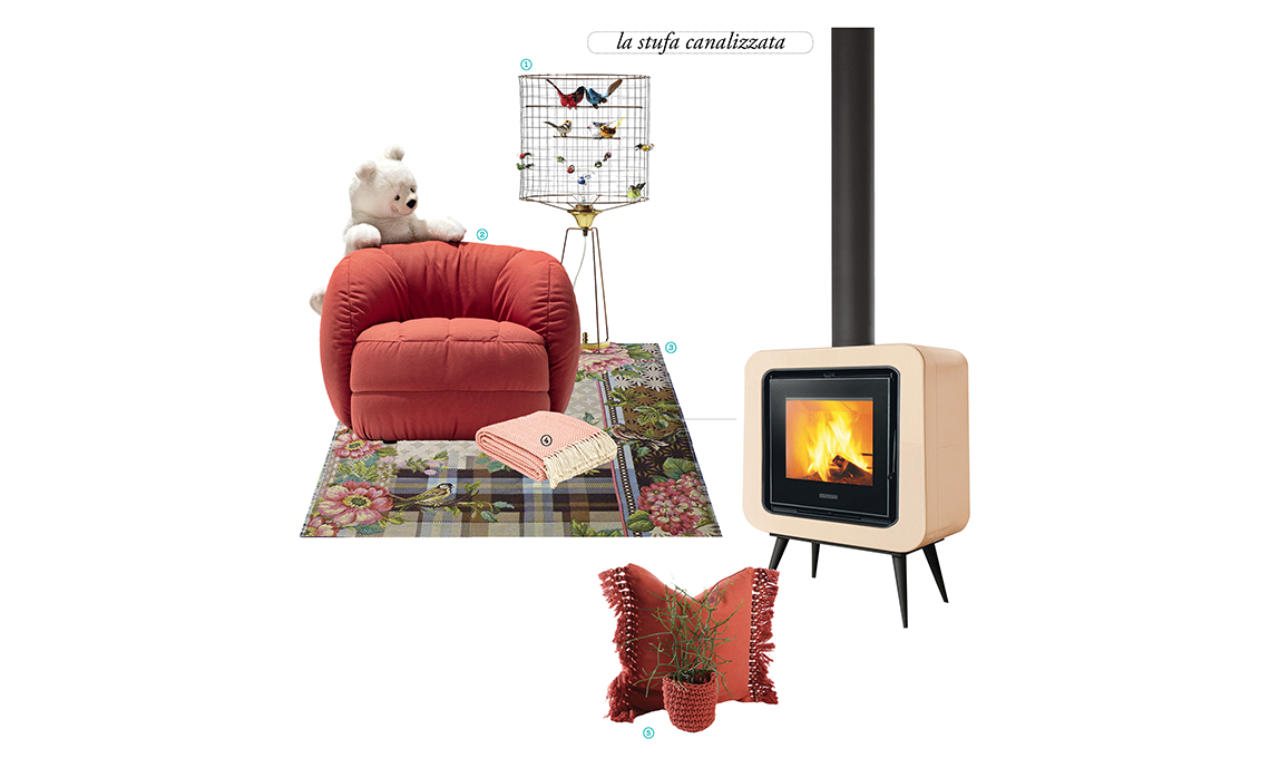 Stufa a legna Thelma [Piazzetta, cm 71x46x100h]. 1 lampada da tavolo Volière Haute, in rame [Mathieu Challières, ø cm 33x72h]. 2 poltrona Reef, con rivestimento realizzato con oltre 100 bottiglie di plastica recuperate dal mare [Connubia, cm 96x91x76h]. 3 tappeto Morning Twittering, in tessuto jacquard [Miho Unexpected Things, cm 140x140]. 4 plaid Coral Herringbone, realizzato con 300 bottiglie di plastica [Weaver Green, cm 130x230]. 5 cuscino Fringe in cotone e perline di legno riciclati [Heather Orr, cm 51x51].