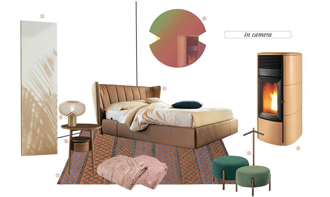 1 radiatore Frame Trends Etereo, in acciaio al carbonio con decoro verniciato [Cordivari, cm 35,2x102,2h disponibile dal 2022]. 2 specchio Verto Rainbow dai riflessi cangianti [Aytm, ø cm 70 € 299]. 3 stufa a pellet Club colore Sand certificata 4 stelle; la struttura totalmente stagna garantisce efficienza e perfetta qualità dell’aria in ogni ambiente [MCZ, cm 56x55,4x115,2h € 2.992]. 4 letto Leonte con sistema PopUp® dai comodini e cassetti estraibili, in pelle con zip celeste [Noctis, cm 207x230x116h € 5.340]. 5 pouf Flag che, dotato di gruccia, diventa servomuto [Bolzan Letti, cm 64x41h da € 778]. 6 trapunte in cotone Soffio di Neve e Plops in rosa [Fazzini, cm 270x270 da € 239]. 7 tappeto Rubia in lana a trama piatta con lavorazione 3D [Karpeta, cm 170x240 € 1.086]. 8 comodino Episode in noce americano massiccio [Ligne Roset, cm 50x40x60h € 1.108]. 9 lampada Bloom con diffusore in vetro rosa [Il Fanale, ø cm 30x287h € 787].