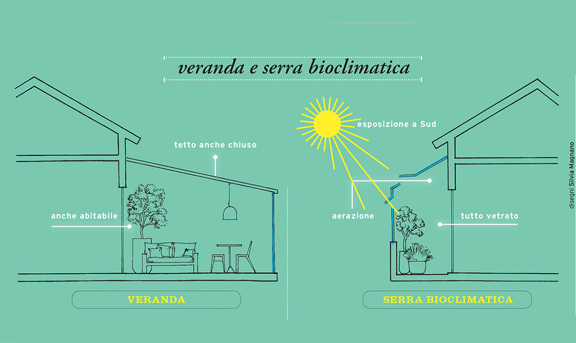 Un vano vetrato integrato alla facciata più soleggiata: serve per catturare e conservare l’energia solare per cederla, poi, ai locali interni; migliora il risparmio energetico, il comfort e il clima della casa. Si chiama anche serra solare o captante.