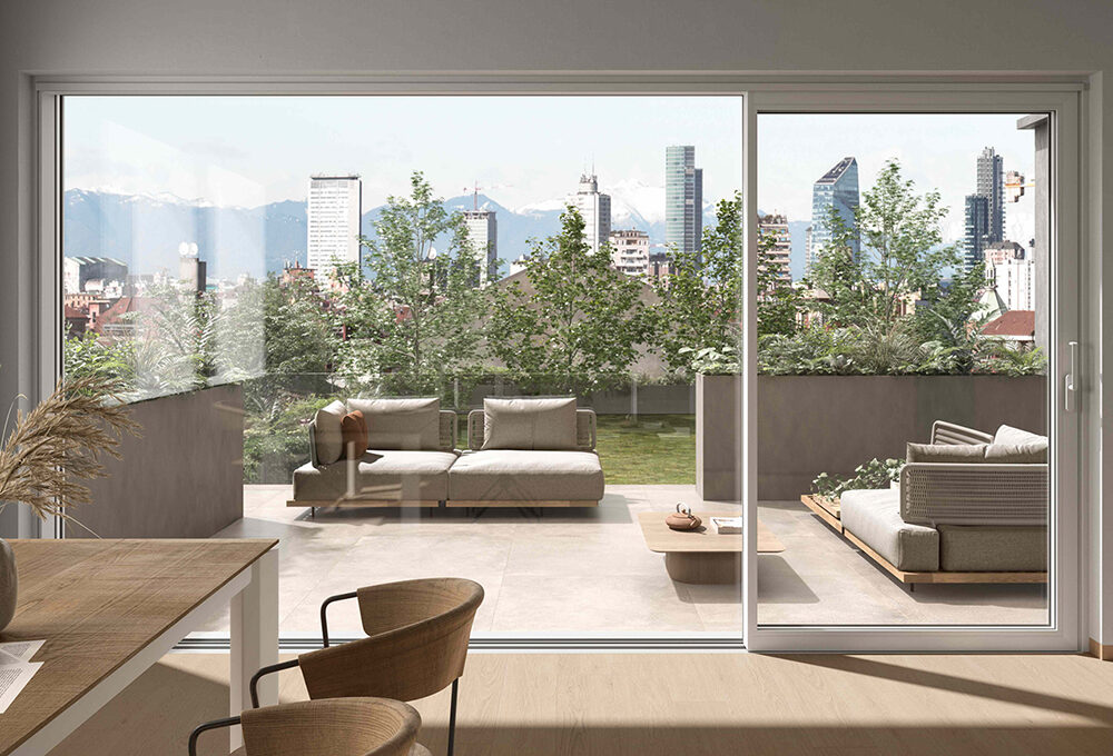 Stufa ibrida E228 MH Terra Cotta [Piazzetta], vasca centro stanza Linda X e rubinetto Joy [Ideal Standard], sistema scorrevole in alluminio Schüco ASE 67 PD [Schüco Italia], lampadine WiZ [Signify].