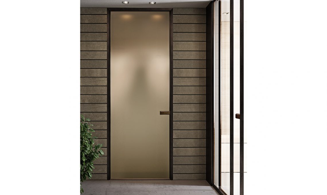 La porta a battente Luxor ha struttura in alluminio lucido più pannello, stipite e maniglia rivestiti in cuoio fango, con cucitura in cotone Rimadesio, cm 80x210h da € 1.989].Addio misure standard: il fascino di molte porte è oggi quello di poter essere realizzate alte anche fino al soffitto, per creare ‘tagli’ minimalisti nei muri e dare un look moderno ai locali.