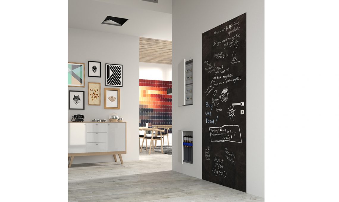 La porta a filomuro Essential Battente, con finitura effetto lavagna, è davvero ‘solo tua’ e cambia ogni giorno: libera l’artista che c’è in te, o nei tuoi figli [Scrigno cm 80x210h, prezzo su richiesta].