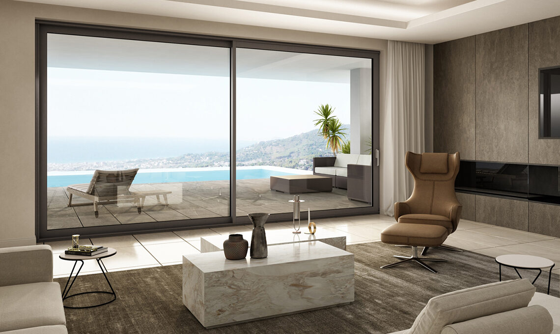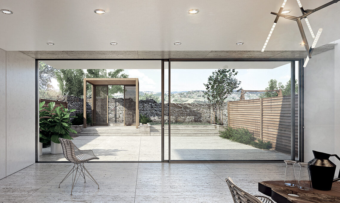 ██ I telai integrati sui quattro lati, i profili a vista di soli 3 cm e i vetri extrachiari definiscono la grande luminosità di Overview SL1300TT, lo scorrevole minimalista ad alto isolamento termoacustico [Ponzio].