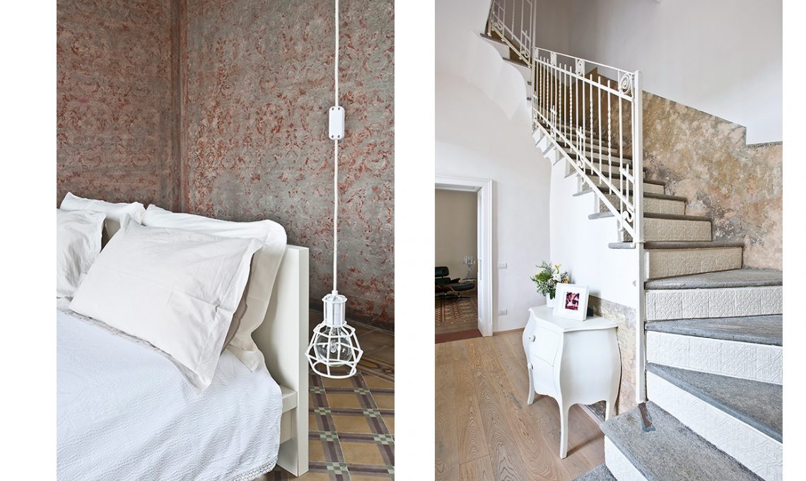 Nella zona letto le lampade sono appese con un risultato décor. La scala è un tripudio di sensazioni ’tattili’: la pedata è in pietra; le alzate sono rivestite da piastrelline con decori a rilievo Arabesque [Domenico Mori].