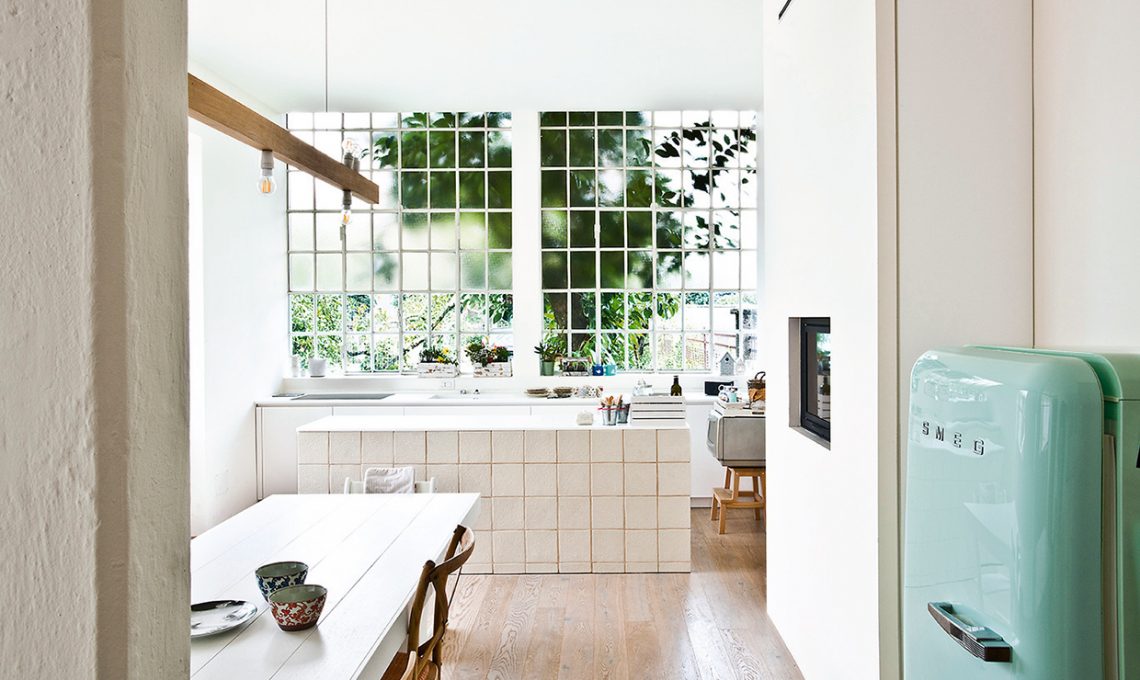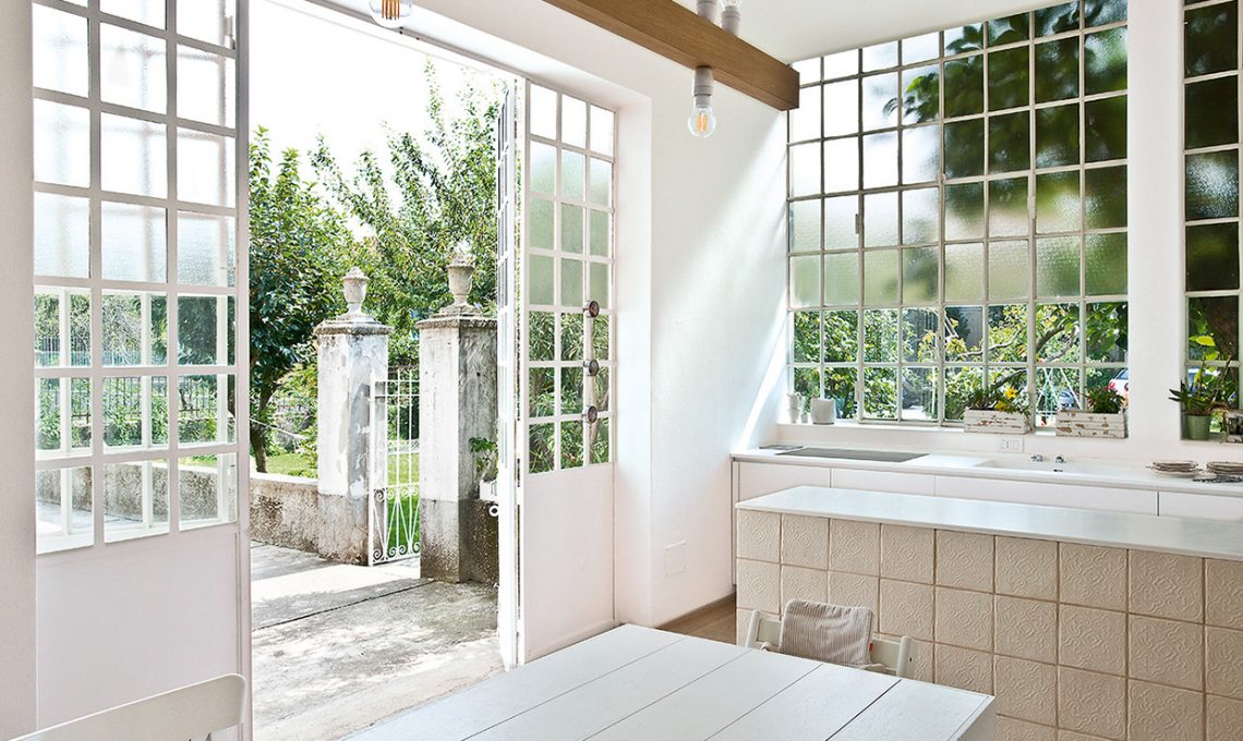 La cucina è stata pensata nell’ex magazzino costruito dai precedenti proprietari intorno al 1930 e usato per tenere cianfrusaglie e vecchi mobili. La scelta estetica? Mimetizzare nel bianco i vani contenitore (il cartongesso che ingloba il camino a legna nasconde due spazi dispensa). La cosa più bella, qui, sono le vetrate antiche che aprono viste immense sul giardino e permettono di cucinare, pranzare, chiacchierare circondati dalla luce e dal verde dei rami. E il bianco amplifica queste magiche presenze.