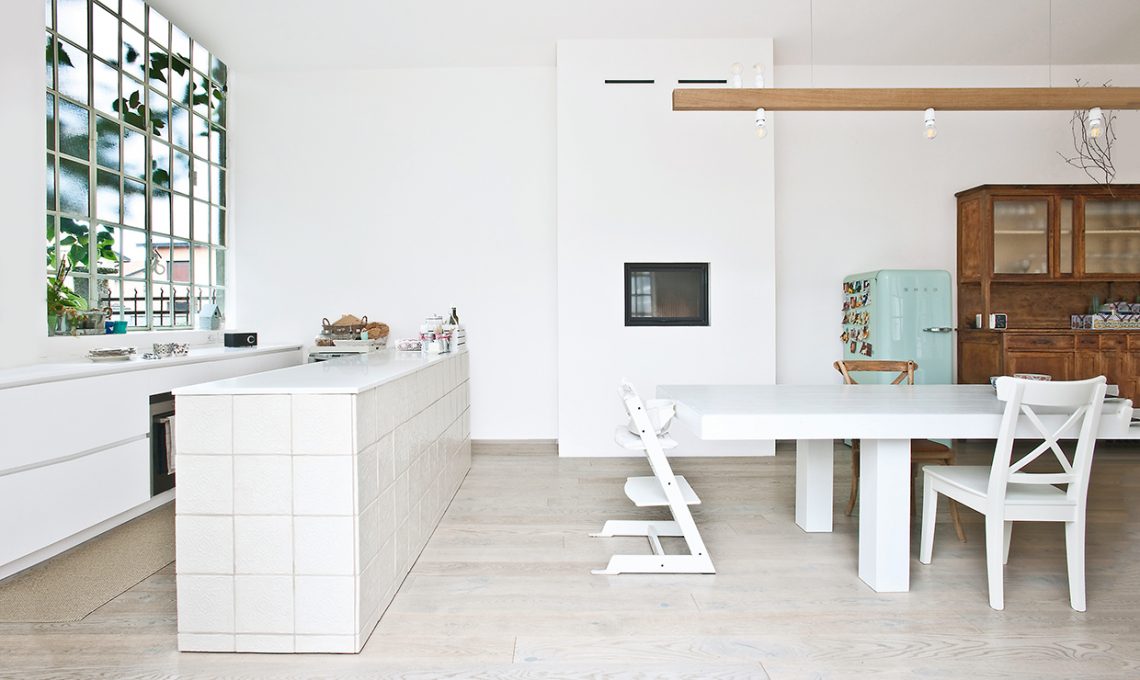 Il cartongesso che ingloba il camino a legna nasconde due spazi dispensa. Seggiolone Tripp Trapp [Stokke €189], sedie Ingolf [Ikea €44,99] e in legno Tradition [Maisons du Monde €89,99].