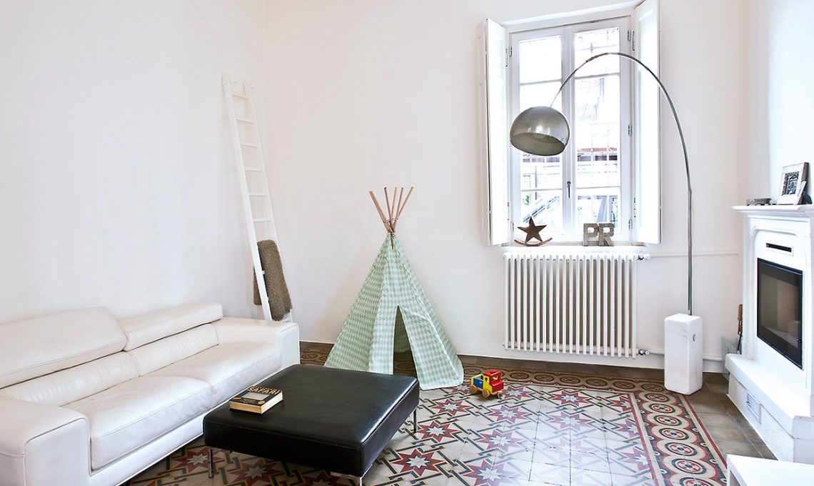 Il living è ancora un ’work in progress’. I proprietari vorrebbero cambiare il divano e aggiungere qualche decorazione. Tenda Tipi Arizona a rombi verdi per il piccolo di casa [Nobodinoz €54,95].