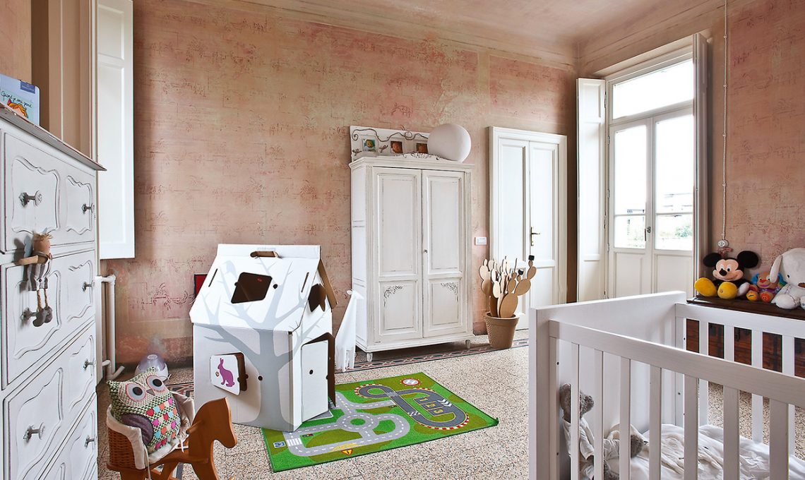 In cameretta gli arredi sono tutti bianchi e tutti diversi, alcuni recuperati al mercato delle pulci. Casetta [Studio Roof €21 in vendita su http://www.lovethesign.com]; lettino [Marina Dal Santo].