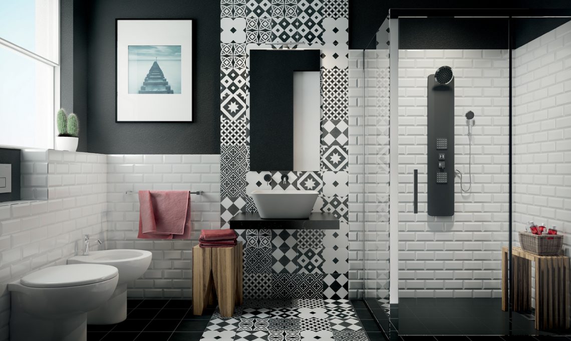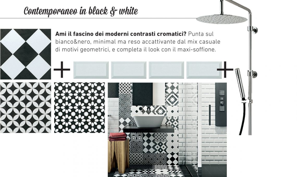 Abbina le piastrelle Gatsby Mix nero/bianco (ref. 35536480, cm 20x20, €19,90/mq) al rivestimento Metro bianco lucido (ref. 34985104, cm 7,5x15, €19,90/mq). Completa il relooking con la colonna doccia Jacuzzi Rangiroa: soffione tondo in acciaio ø cm 30, doccetta a 1 getto e miscelatore termostatico (ref. 36070132, €395).