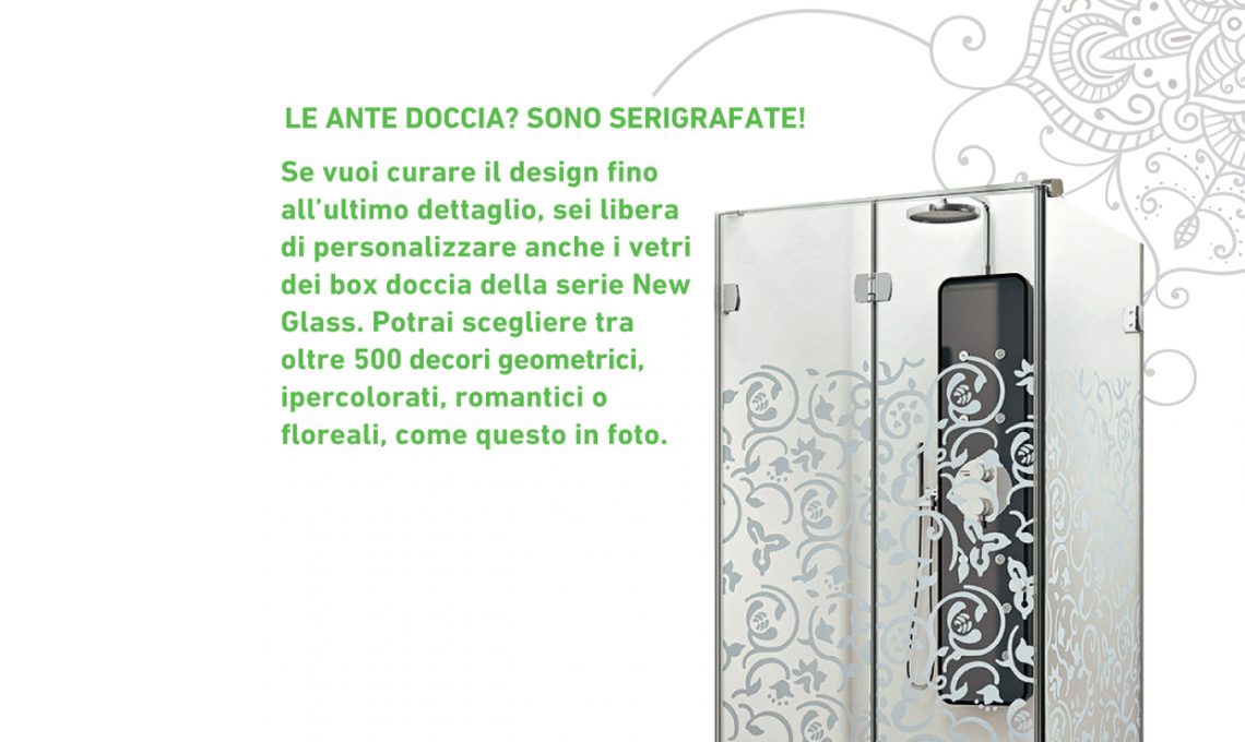Se vuoi curare il design fino all’ultimo dettaglio, sei libera di personalizzare anche i vetri dei box doccia della serie New Glass. Potrai scegliere tra oltre 500 decori geometrici, ipercolorati, romantici o floreali.
