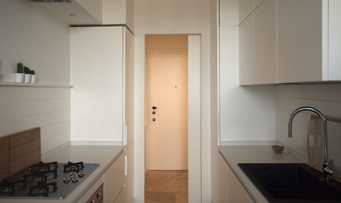 Lungo il corridoio è stato inserito un armadio a muro per tutta la sua lunghezza, così da aumentare al massimo lo spazio contenitivo. Per lo stesso motivo, in cucina i mobili sono tutti su misura, compresa la colonna dispensa/ripostiglio.