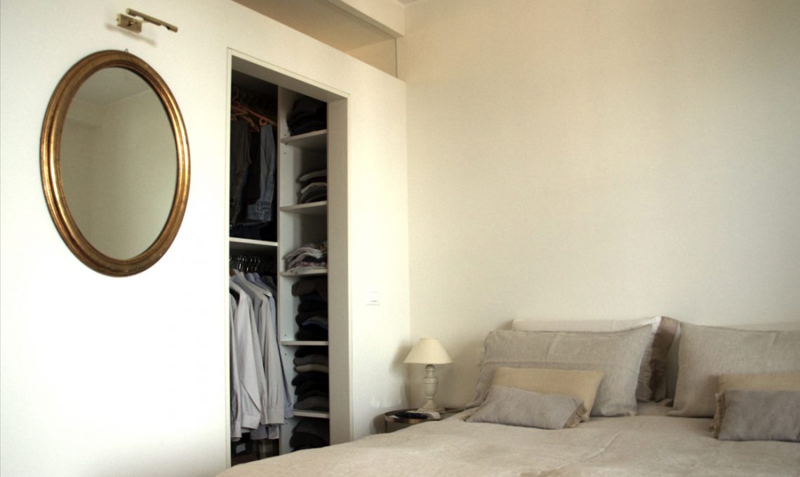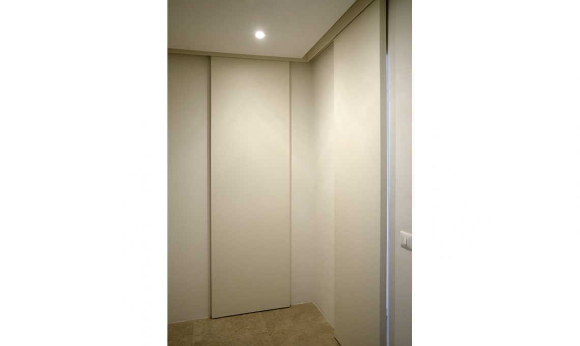 In camera, accanto al letto si apre la porta scorrevole attraverso la quale si accede alla cabina armadio. Per aumentare la luminosità dei locali si è scelta una palette di colori neutri chiari.