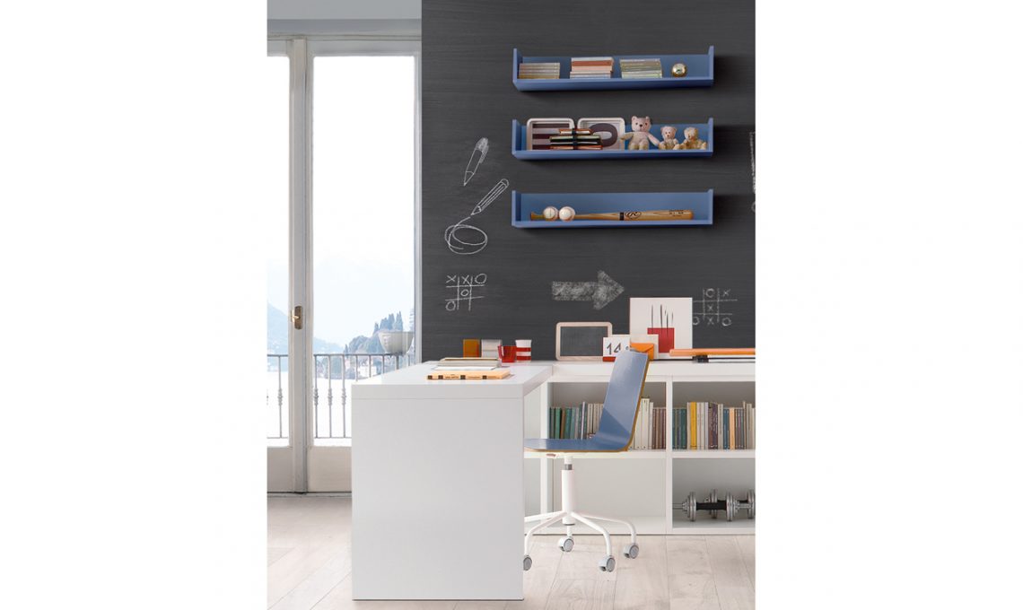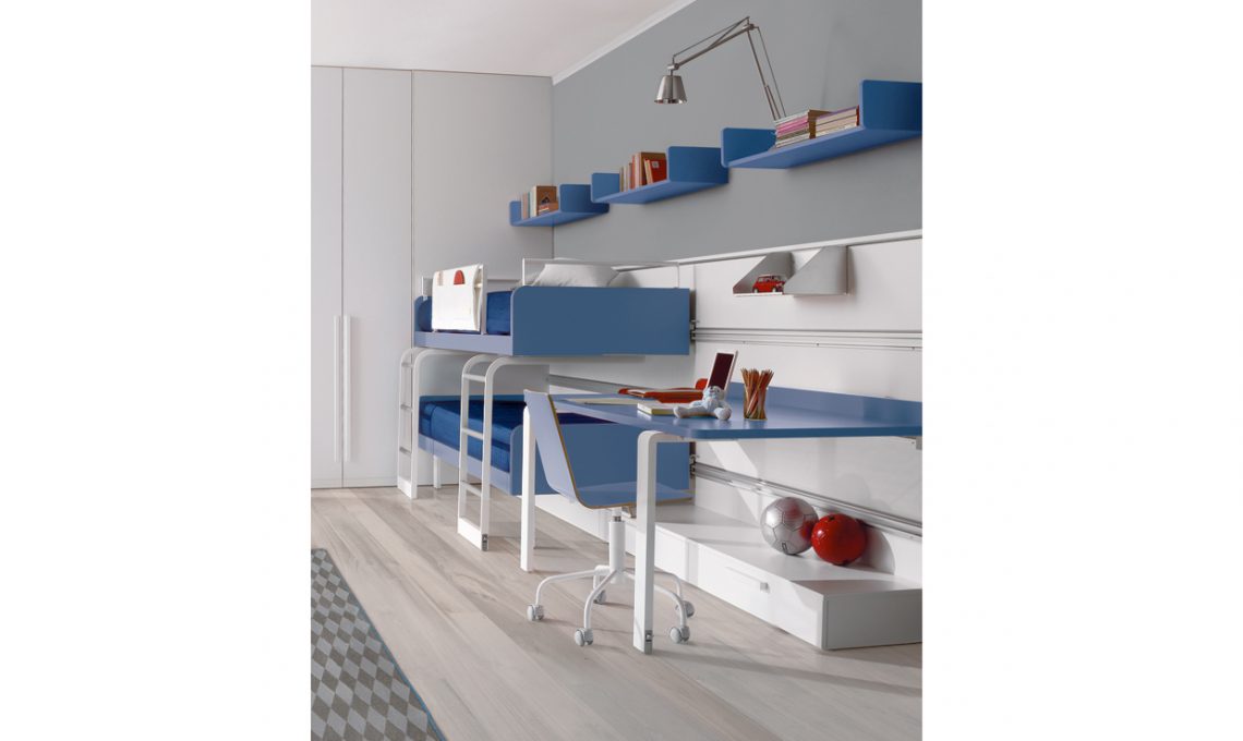 La composizione Z86 in bianco e blu baltico è formata da 3 elementi: la boiserie lungo la quale scorrono i due letti e uno scrittoio (cm 360x107,5x136,2h), la cabina armadio che sfrutta l’angolo (cm 108,8x103x256h) e la seconda scrivania a elle (cm 167,8x150x75h) più mensole [Multispazio di Zalf].