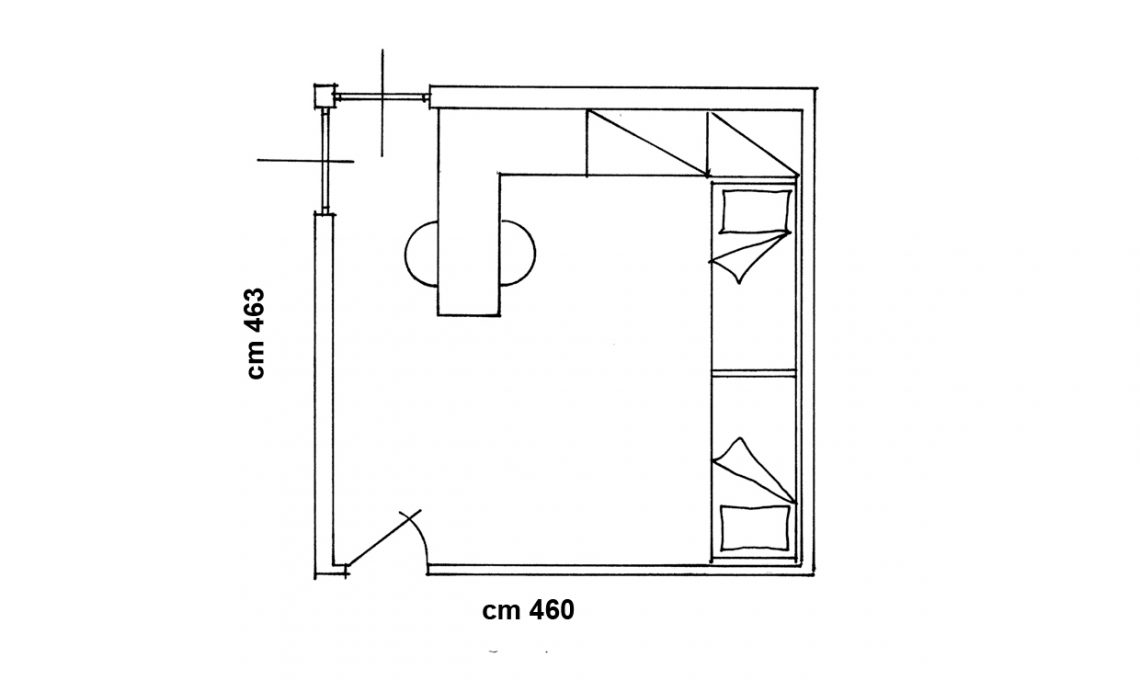 La camera è praticamente quadrata (cm 460x463) con porta e finestre in due angoli consecutivi: si sfrutta la parete maggiore e libera con la boiserie su cui scorrono letti e scrittoio, nell'angolo la cabina armadio e, a chiudere la composizione, la seconda scrivania a elle.