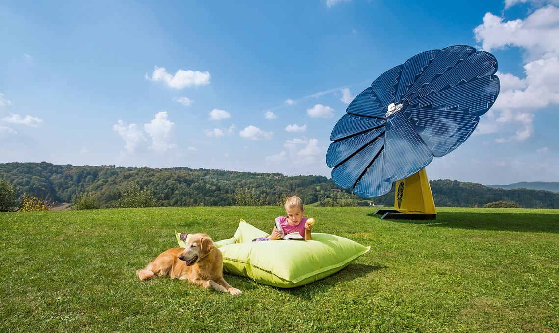 In questo modo nascondono alla vista tuti i componenti tecnici. Ma anche qualche segreto: come la piramide fotovoltaica che, sfruttando i vantaggi della tridimensionalità, assorbe in modo continuo e più costante l’energia solare. O come il ‘fiore fotovoltaico’ che aprendosi e girando come un girasole in cerca della luce, segue il sole dall’alba al tramonto per non perdersi nemmeno un watt di energia, fino a chiudersi la sera.