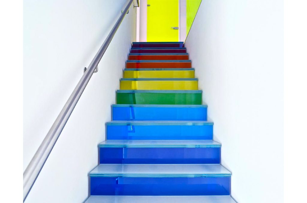 Gradini multicolore realizzati abbinando i vetri stratificati SGG Stadip Protect e Stadip Color® [Saint-Gobain Glass]. Misure e prezzi tutti su progetto.