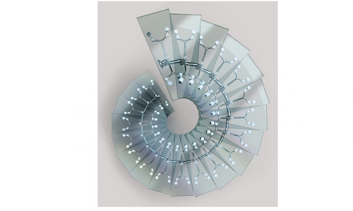 Al soppalco in vetro strutturale calpestabile si accede dalla scala a giorno Ninfa, con pedate in finitura satinata [Faraone, misure e prezzi su progetto].