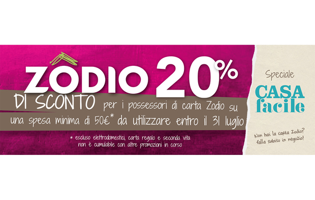 E le novità non sono finite: per tutto il mese di luglio su una spesa minima di 50€ (con carta Zodio)* avrai lo sconto del 20%. Mostra il coupon CasaFacile alla cassa, non è necessario stamparlo.