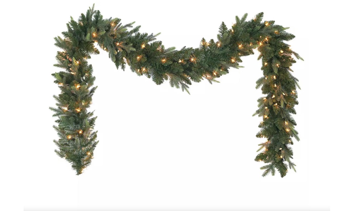 Festone sintetico Norway Spruce con stringa di luci a batteria [Balsam Hill, da cm 183 da € 125].