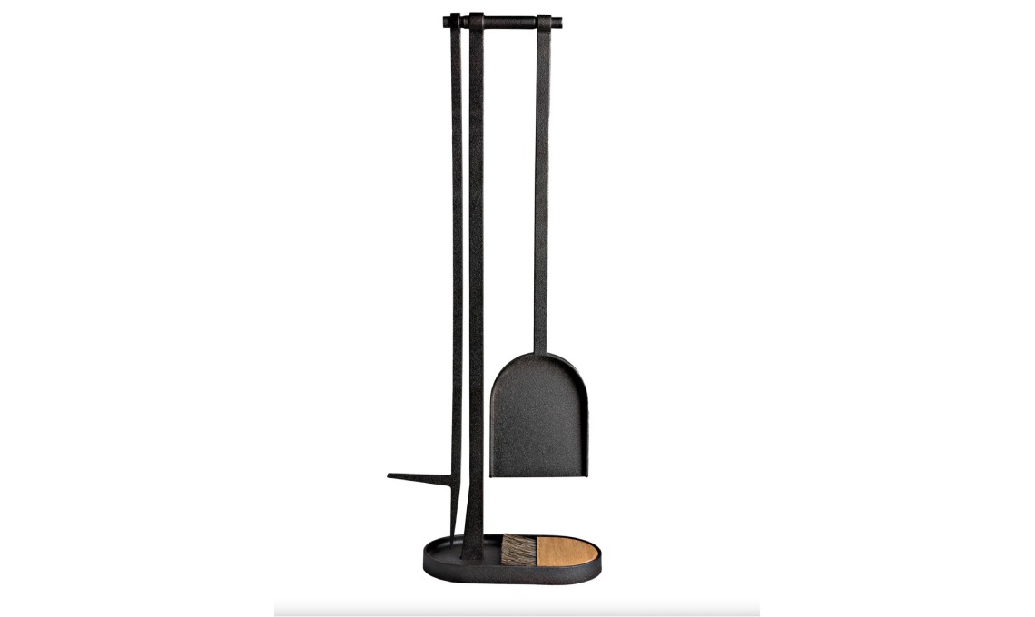 di attrezzi per camino con supporto in ghisa Fireworks. Include spazzola in rovere, attizzatoio e paletta [Korbo, cm 11x22x60h € 267].