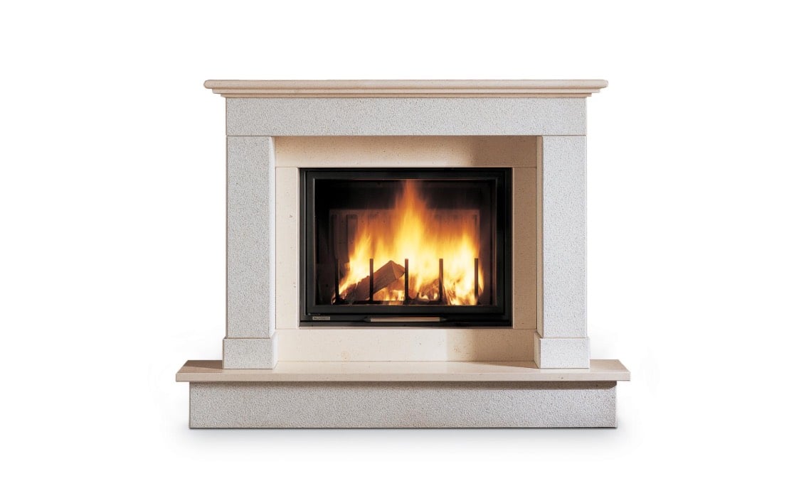 Camino Siena con cornice in pietra bianca bocciardata e con piano e riquadri lucidi [Palazzetti, 150x30x116h € 3.526].