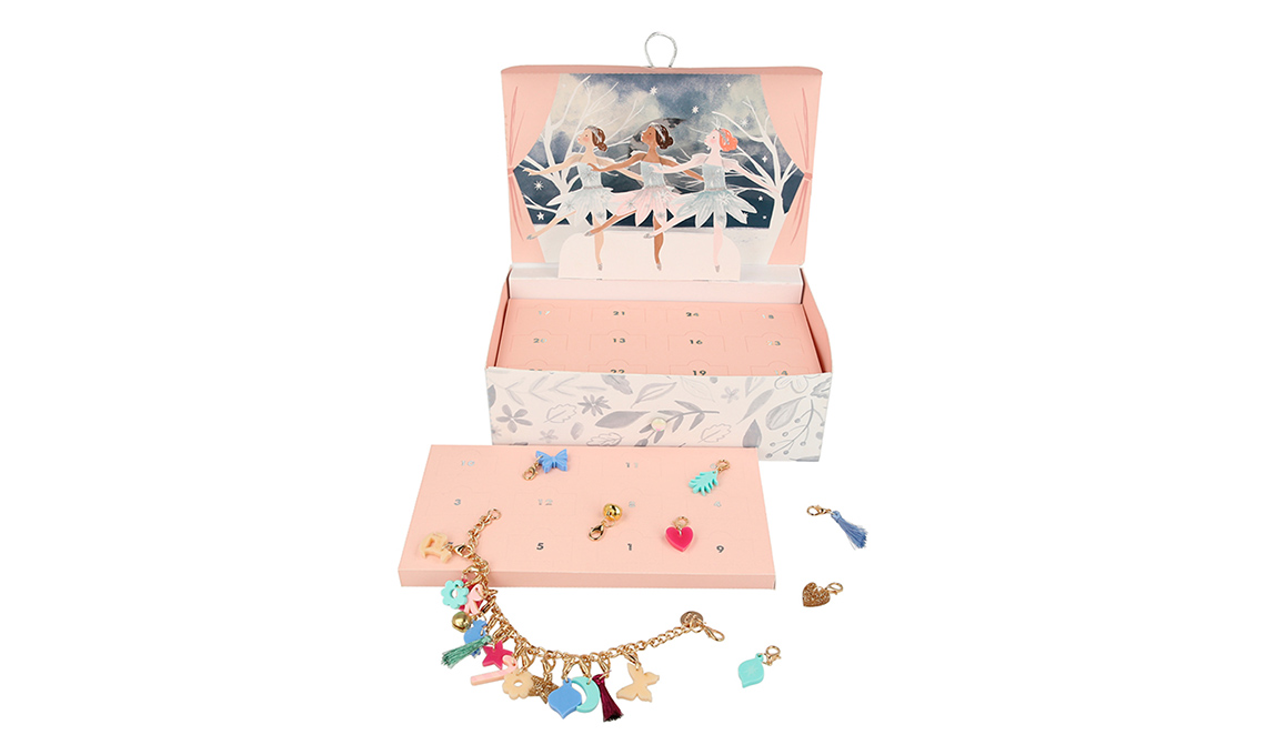 Il calendario dell'avvento a forma di piccola valigia rivelerà passo dopo passo un grazioso braccialetto con charm festivi [Meri Meri]