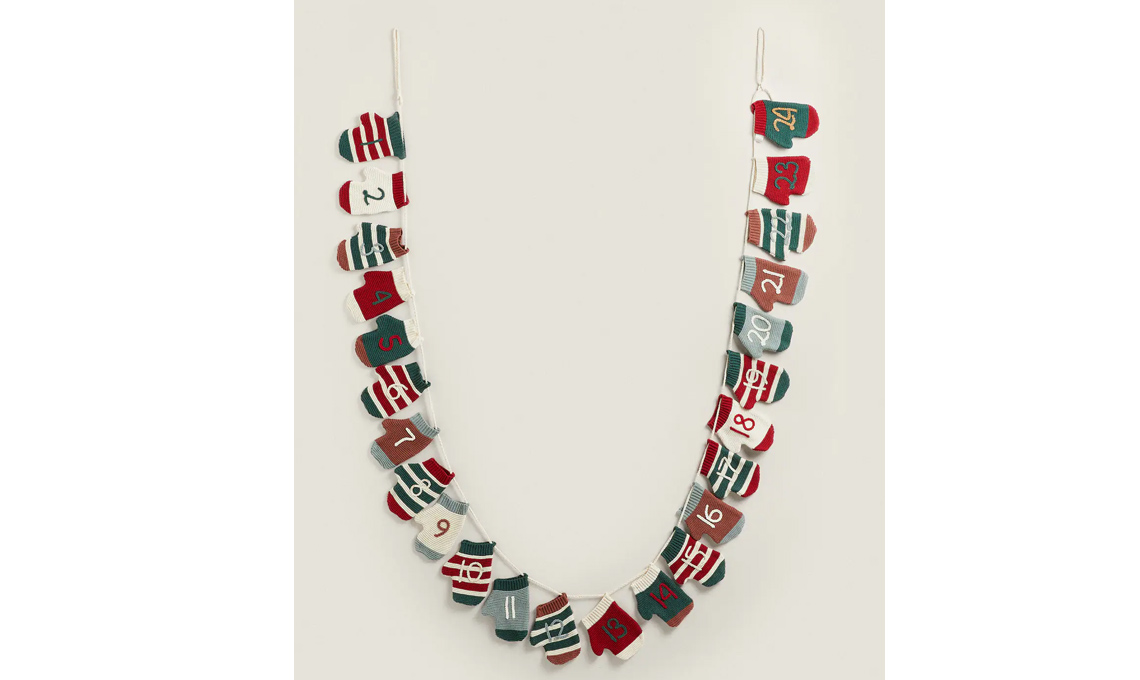 Ghirlanda realizzata in maglia con il calendario dell'Avvento per inserire regalini [Zara Home].