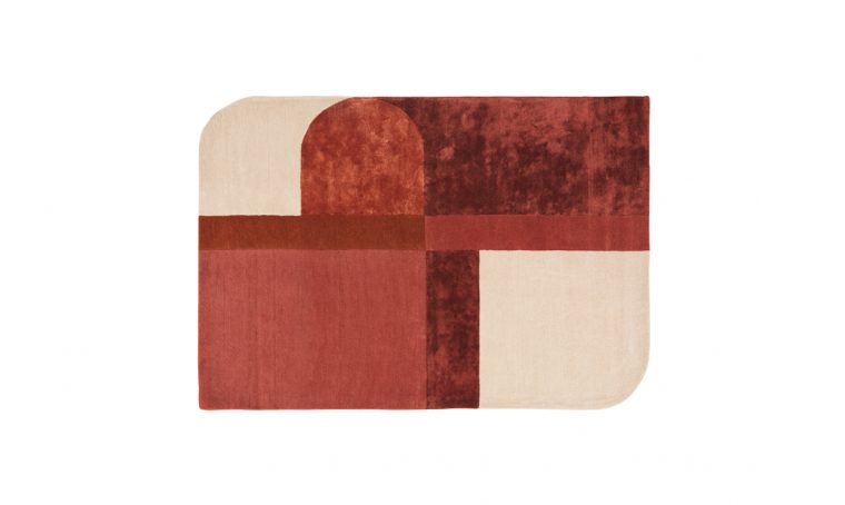 Richiama una foglia il tappeto sostenibile Rime Imperfette, trattato per l’outdoor [G.T.Design, cm 176x300 da € 2.657].
