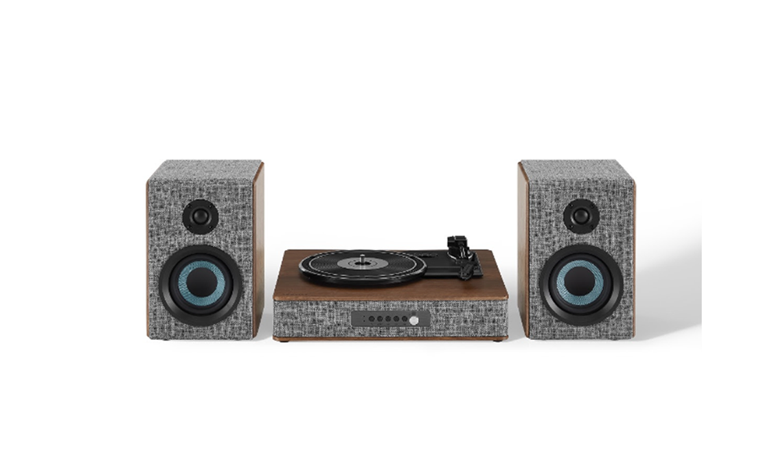 Giradischi Aria con altoparlanti. Tre velocità, ricevitore Bluetooth integrato, radio FM e ingresso Aux [Crosley, €232, su moronigomma.it]