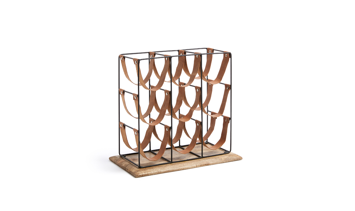 Mucia, porta bottiglie in metallo, legno di mango e pelle [Kave Home]
