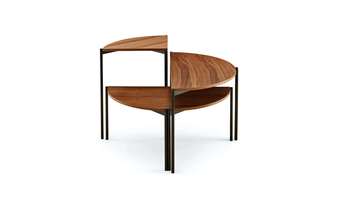 Sovrapposti: Quadran, in noce e acciaio [Ligne Roset, cm 66x33x28h, 70x35x38h, 49x34x48h]