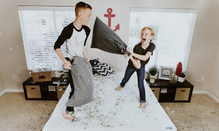Grigio, rosa e carta da parati geometrica per la camera di due adolescenti