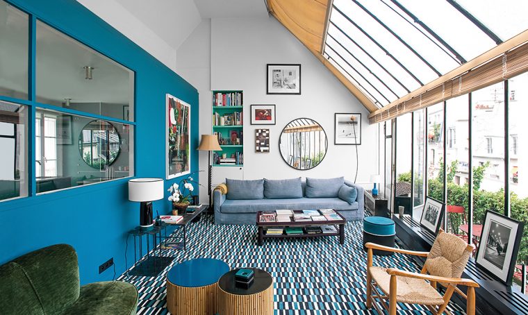 Lo studio si trasforma in casa con arredi vintage e un blu speciale
