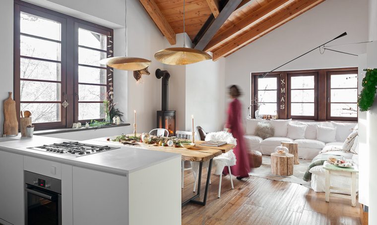 Arredare l’appartamento in baita con bianco, oro e legno naturale