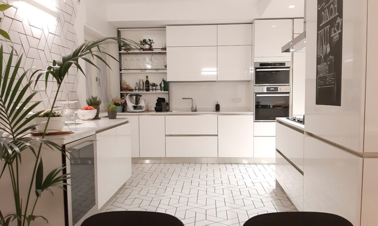 Tanto bianco e rivestimenti materici diventano decorazioni geometriche